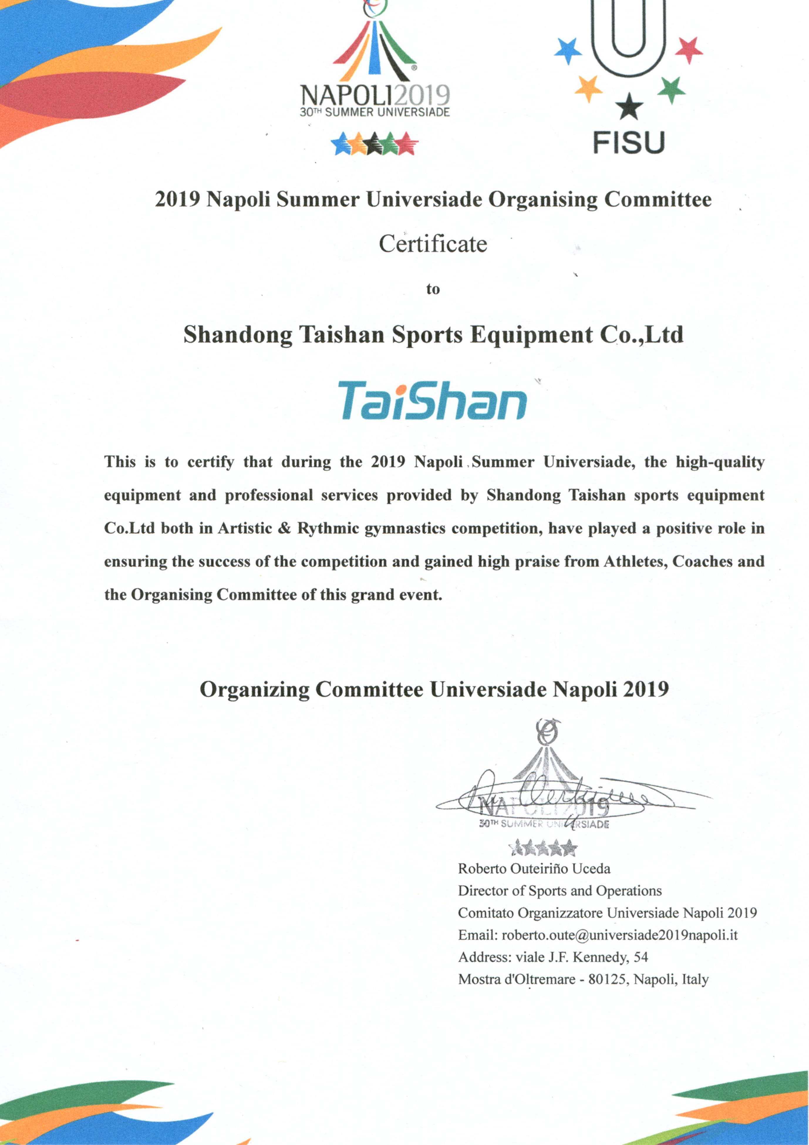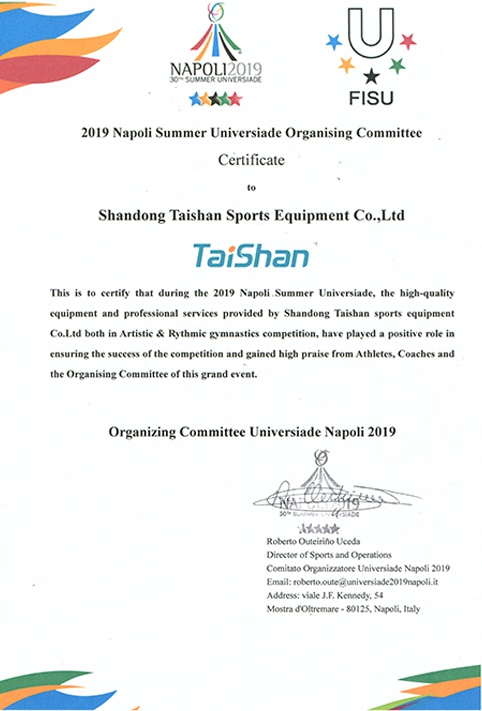 2019年那不勒斯大学生运动会荣誉证书